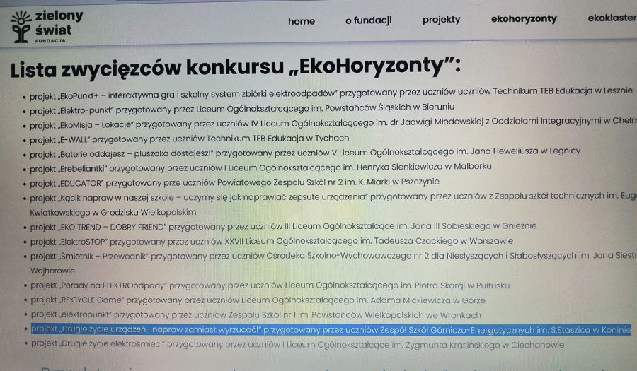 Zespół ZSGE w składzie Anna Olejnik, Maja Staśkiewicz i Hanna Wiśniewska z kl.1 LOI zwyciężył w ogólnopolskim konkursie EkoHoryzonty zorganizowanym przez Fundację Zielony Świat i Ministerstwo Edukacji Narodowej. Konkurs dotyczył pomysłu na innowację społeczno-ekologiczną elektroodpadów.